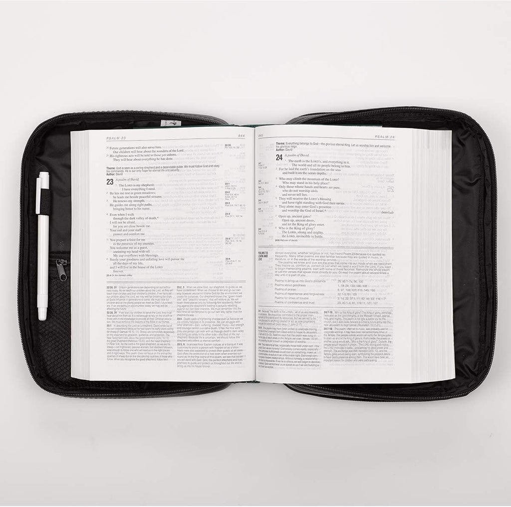 The Bible case's two zippered compartments provide plenty of space for your Bible, a notebook, pens, paper, and more. The first compartment has a slip pocket to secure an included notepad. On the opposite side, you will find another slip pocket for loose paper, three credit card holder slots, and 4 pen loops.