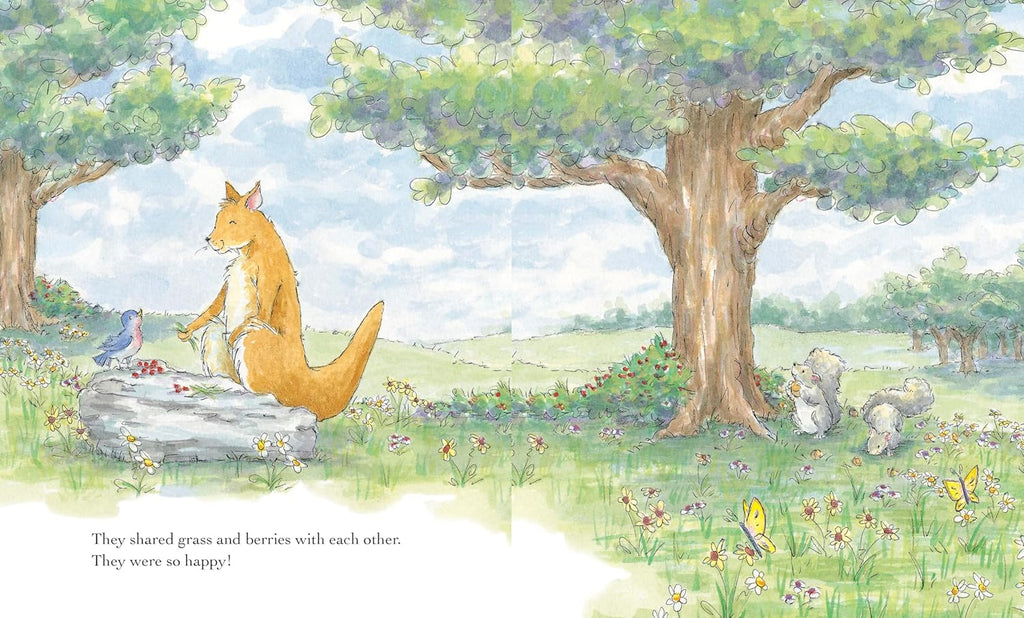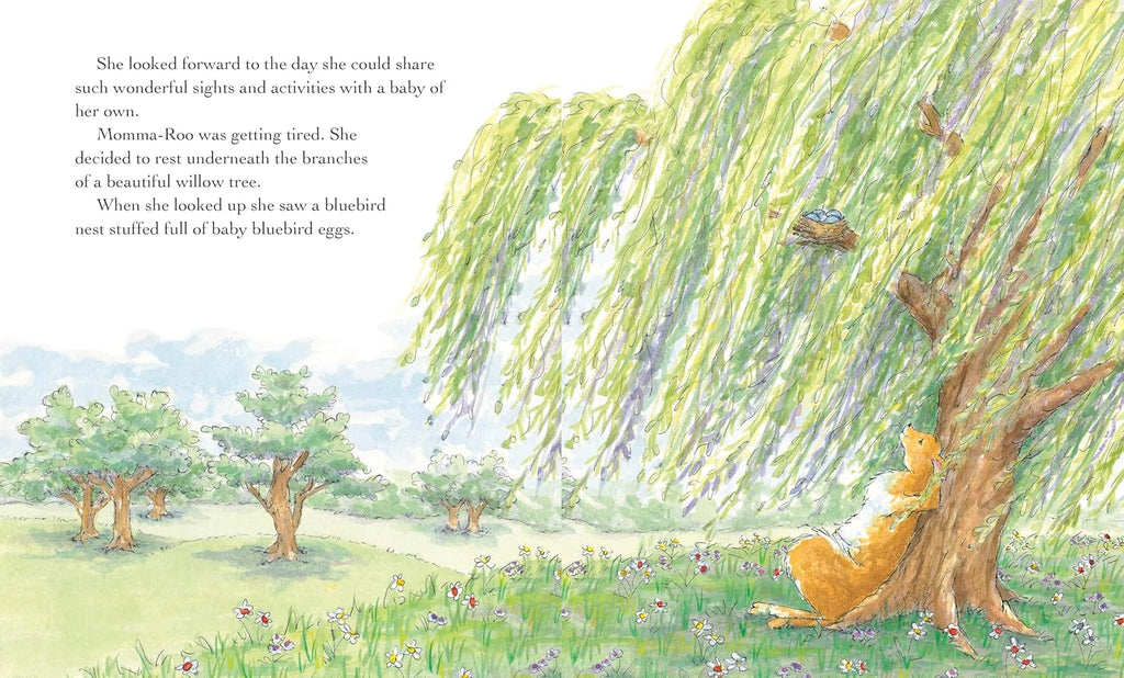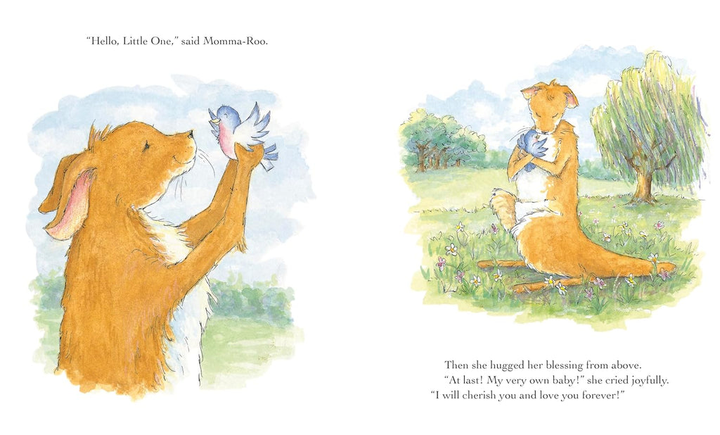 Every night before she goes to sleep, a kangaroo prays under the stars for a baby to love and hold. One day, as she rests under a tree, a baby bird falls out of its crowded nest—plop!—right into her pouch!