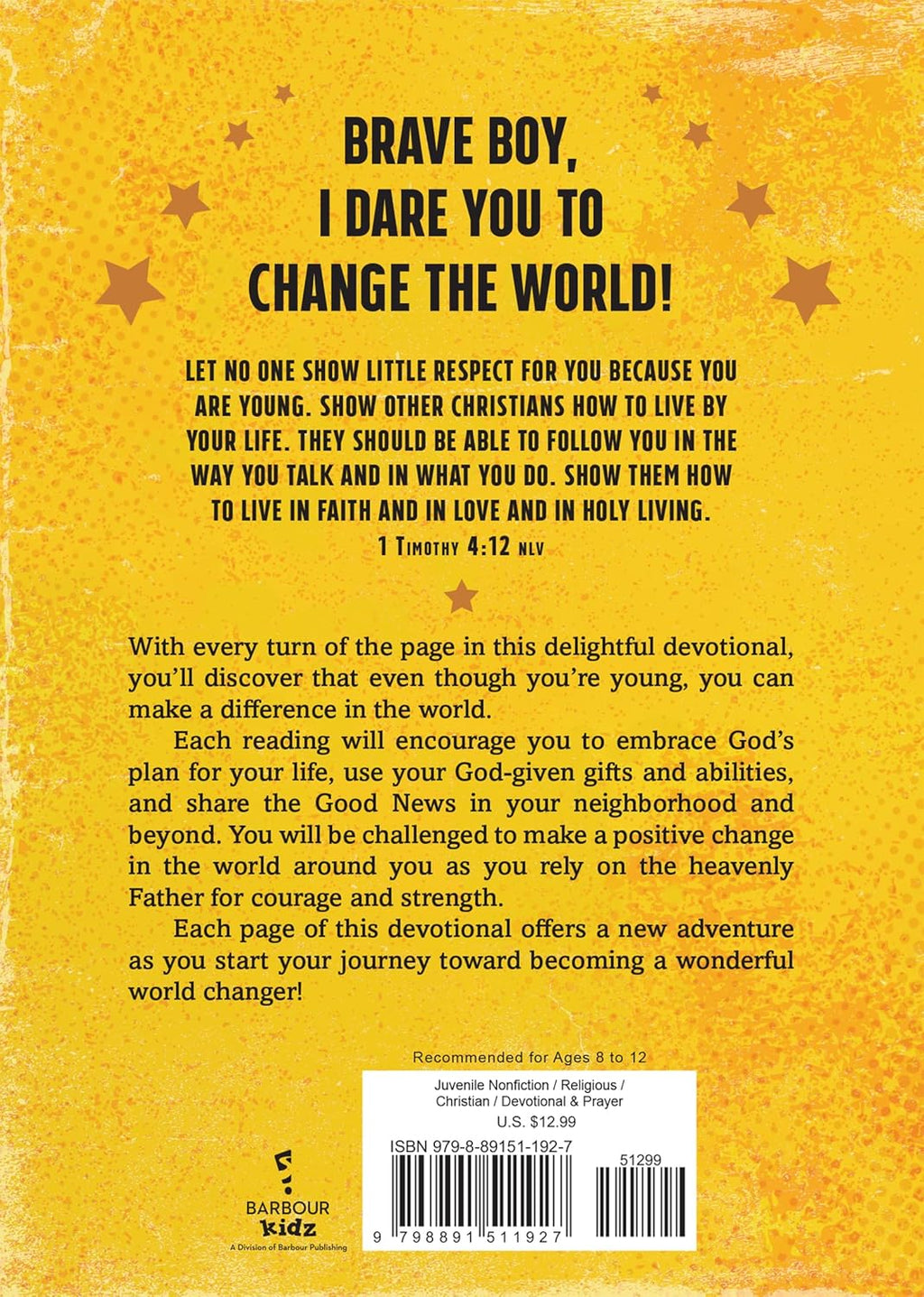 This Daring Devotional Encourages Brave Young Boys to Positively Impact Their World With every turn of the page, the brave boys in your life will discover that even though they're young, they can make a difference in the world. Each devotional reading, rooted in biblical truth, will encourage them to embrace God's plan for their lives, use their God-given gifts and abilities, and share the Good News in their communities and beyond. Boys will be challenged to make a positive change in the world around them as they rely on the heavenly Father for courage and strength. Every page of this devotional offers a new adventure as your boys begin their journey toward becoming courageous world changers!
