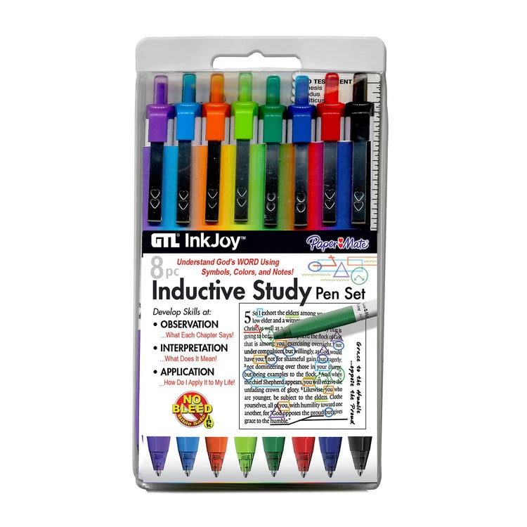 Begin with basic Inductive study protocol using symbols and colors. Each color pen in the set is imprinted with a common inductive symbol. Read, reflect and apply God's Word to your everyday life.