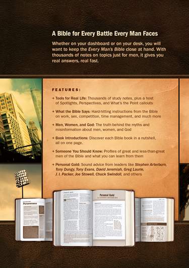 The Every Man’s Bible has thousands of notes on topics just for men―work, sex, competition, integrity, and more. This Bible also includes trusted advice from the pros: Stephen Arterburn, Tony Evans, David Jeremiah, Tony Dungy, Chuck Smith, Jr., Dallas Willard, Michael Youssef, Gordon MacDonald, Bill McCartney, J. I. Packer, Joe Stowell, Chuck Swindoll, Henry Blackaby, Stuart Briscoe, Stephen Broyles, Don Everts, John Fischer, Leighton Ford, Ken Gire, Randy Alcorn, Greg Laurie, Josh McDowell, James Robison, and Gary Rosberg. All of the features and notes were written specifically for men.