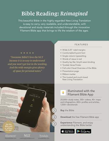The NLT Wide Margin Bible, Filament Enabled is a complete text Bible designed for journaling, note-taking, and reflection that has access to the Filament Bible app, which features thousands of study notes, devotionals, videos, reading plans, and more!