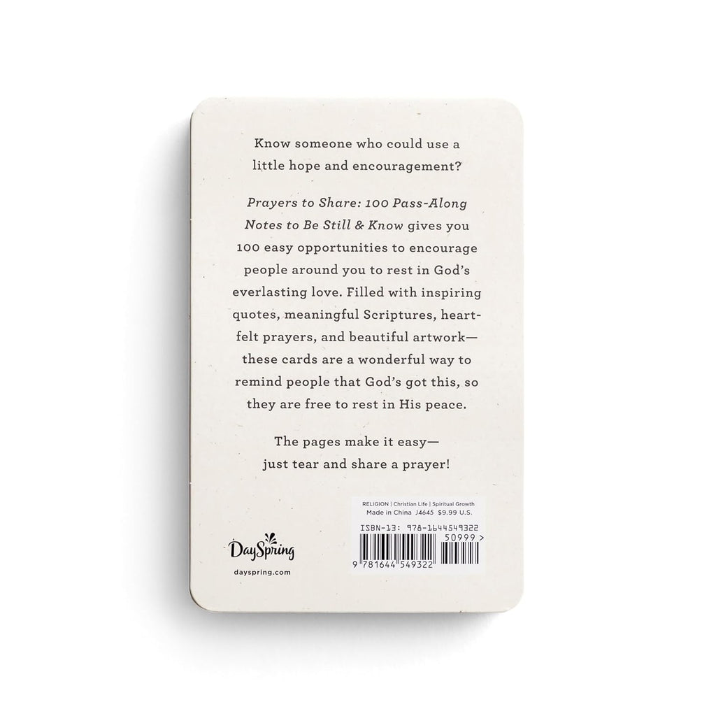 Prayers to Share: 100 Pass-Along Notes to Be Still & Know gives you 100 easy opportunities to inspire the people you care about to rest in God's everlasting love. Let your friends, family and even acquaintances know you are thinking of them, praying for them and they are not alone. God is faithful, present every day and longs to offer His love and strength no matter what life brings.