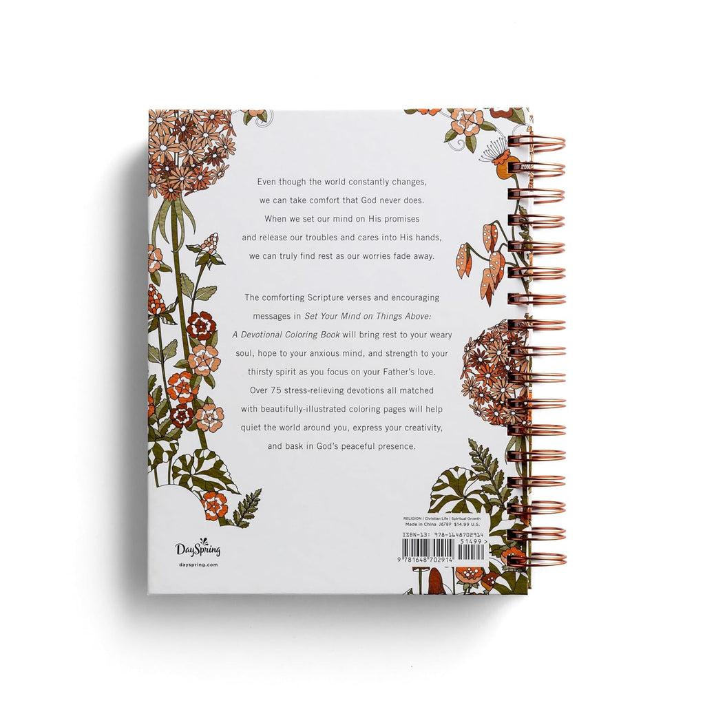 DaySpring's Set Your Mind on Things Above: A Devotional Coloring Book provides a wonderful way to turn your thoughts from worry and fear, and toward God's hope and peace. Matching over 75 stress-relieving devotions with beautifully illustrated adult coloring pages with floral and pattern designs. This spiral bound coloring book is the perfect outlet to creatively express your faith. Just grab your favorite artistic media, crayons, colored pencils, marker pens or paint and escape into the quiet peace of the presence of God.