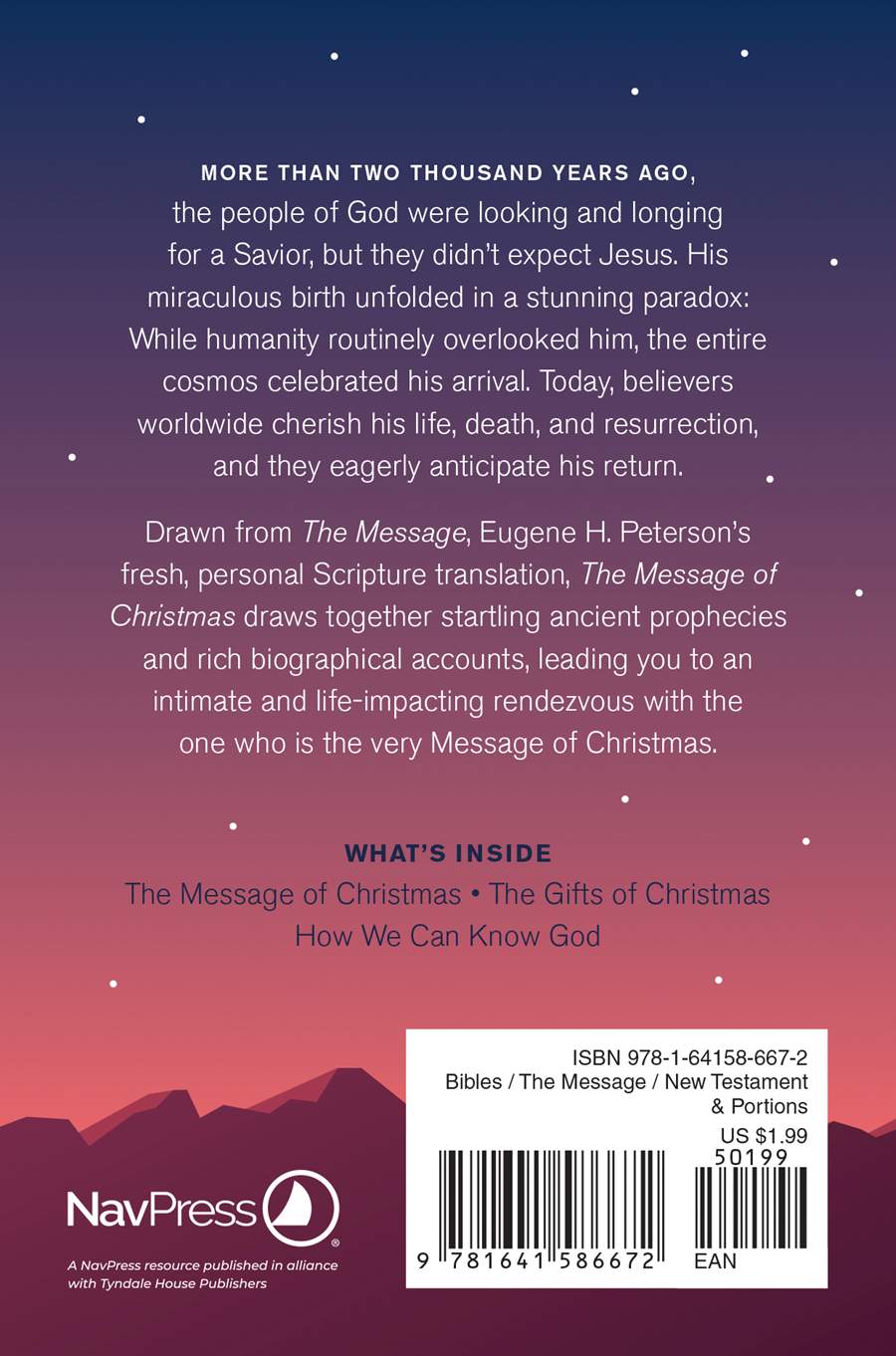 The Message of Christmas is a pocket-sized booklet that shares the biblical story of Christmas in the contemporary and engaging language of The Message Bible. It is the perfect way to personally share the hope of Christmas with neighbors, church visitors, or anyone curious about the meaning of Christmas. The selected passages of Scripture highlight the nativity narrative and the love and hope given to mankind through Christ’s birth.