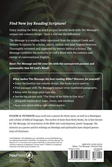 In the front of the Bible, Eugene Peterson helps readers learn to use a “reading Bible.” In the back, the Topical Concordance will help them find Bible passages on more than 80 topics, including doubt, anger, love, and money. With “The Story of the Bible in Five Acts,” and additional charts and maps, anyone can feel at home in the world of the Bible.