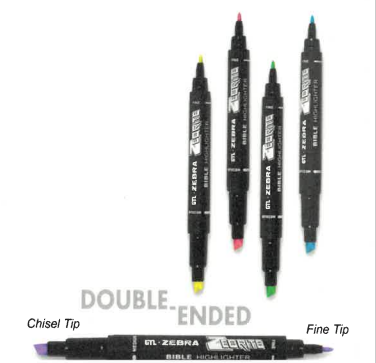 "Wet" highlighter that won't bleed through thin paper. Pigmented ink won't smear or fade. Double-ended design allows users to boldly highlight or precisely underline. Available in blue, green, or purple.